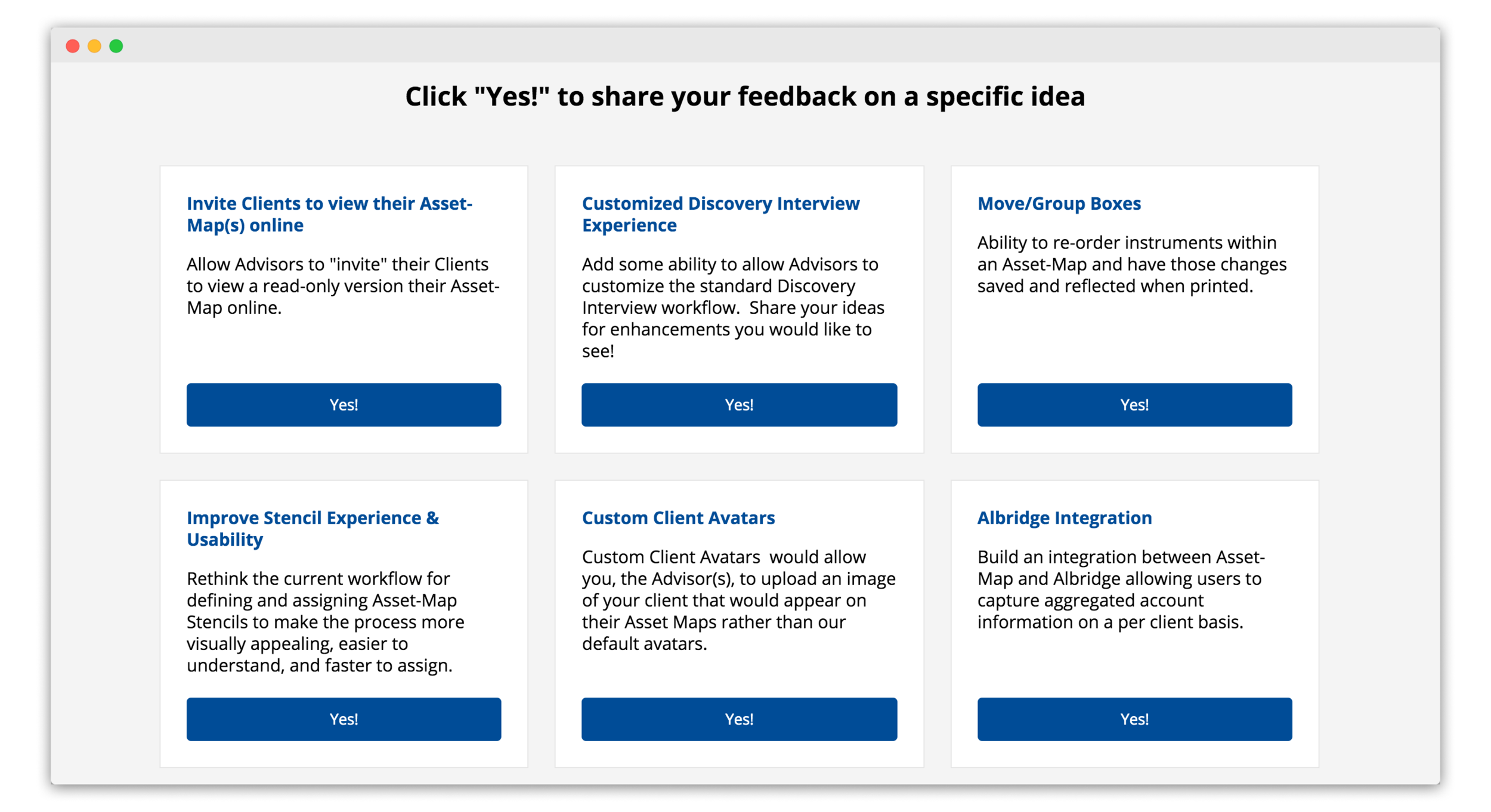 Asset-Map strives to bring a best-in-class Fintech experience to financial professionals around the world through. After listening to our community, we have taken steps to create a feedback system that will allow users to post new ideas and vote on current requests in the pipeline, ultimately allowing us to quickly make improvements and create a better experience.