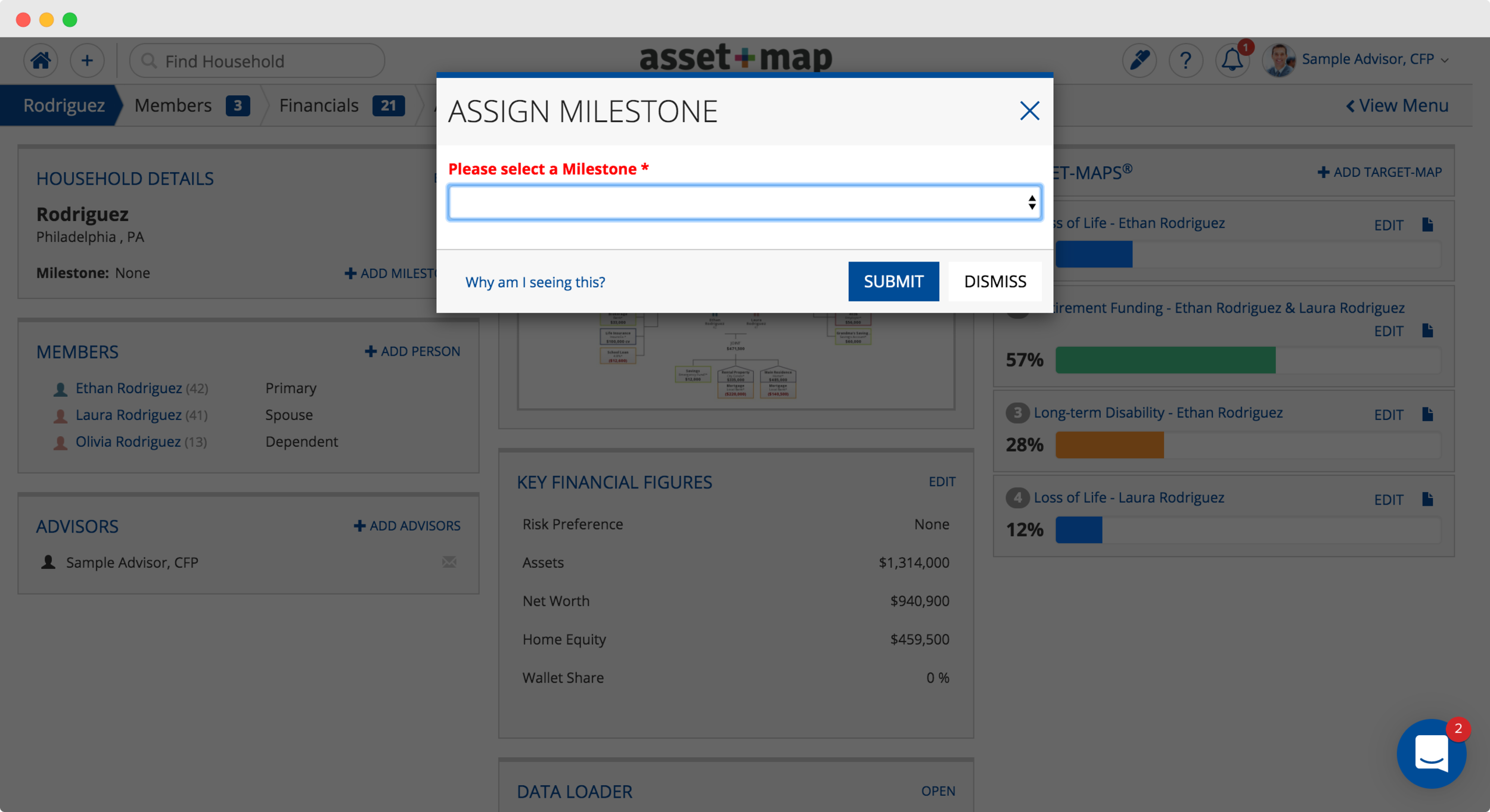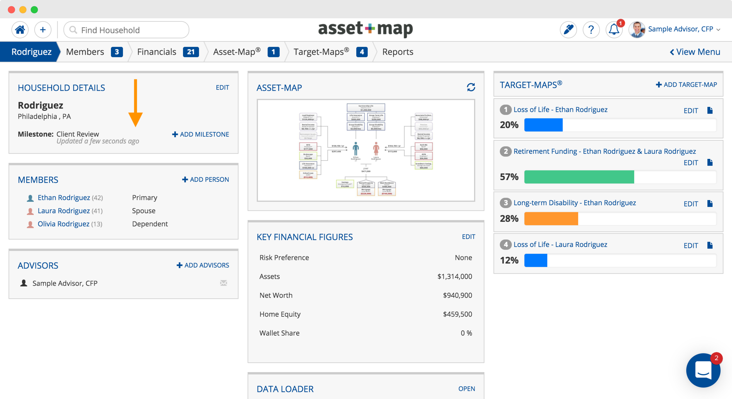Once assigned, the Milestone appears on the Asset-Map Household details tile within the Household Summary page (see below), which is also where advisors can manually launch the Milestone drop-down box in order to update the current status.