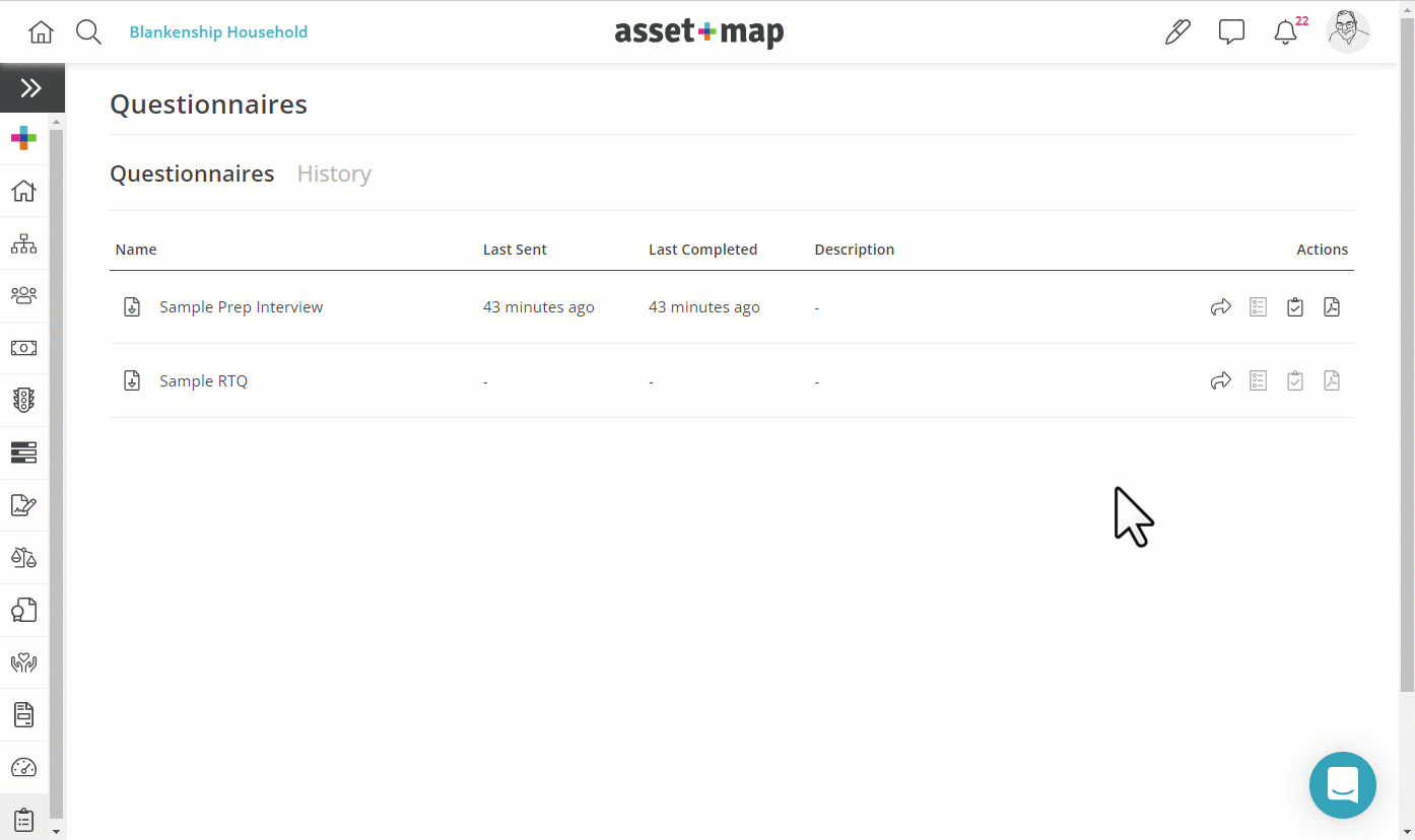 Incorporate a formatted Questionnaire to gather the vital information of a client in one place. Custom Questionnaires can be sent to the client before the meeting, as a meeting takeaway or even completed in the meeting itself. Choose up to 10 customized questions with ‘free text,’ ‘radio-button’ or ‘pick-list’ answer sets.