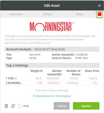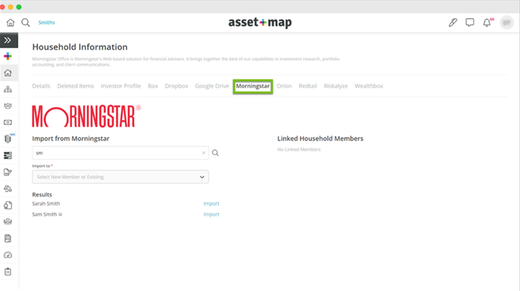 Quickly and easily create new households or update an existing household with our synchronization tool. The Asset-Map and Morningstar integration is as simple as clicking a button to import the relevant data, whether it be an individual client or an entire household.