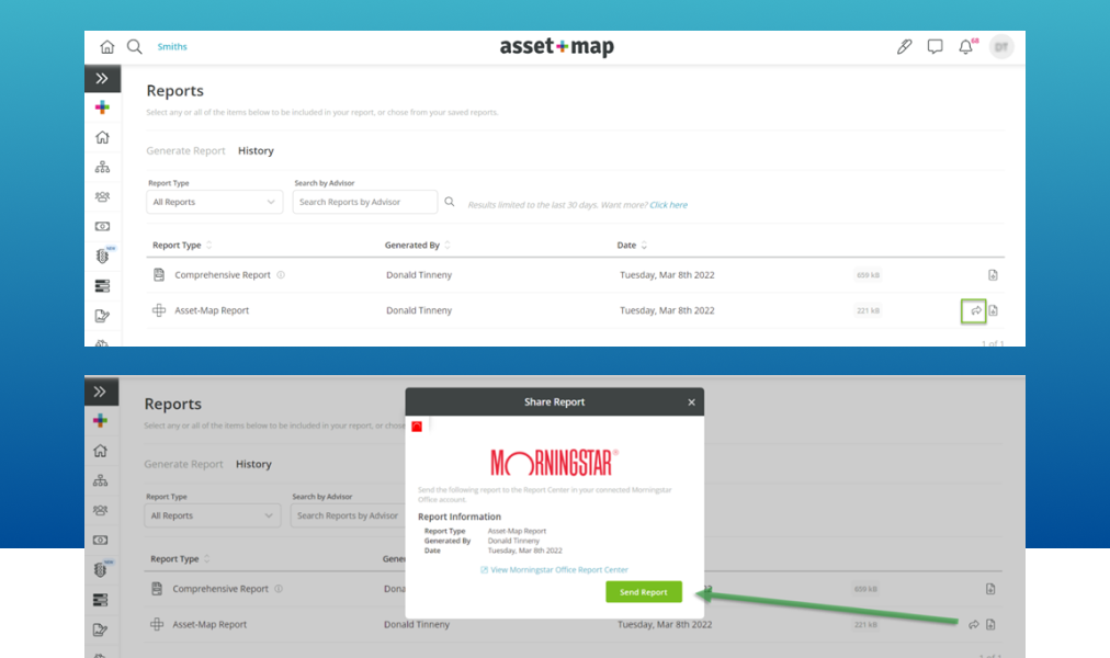 Seamlessly share a copy of any previously generated Asset-Map Report directly to Morningstar Office for review, reference, or publishing at the click of a button.
