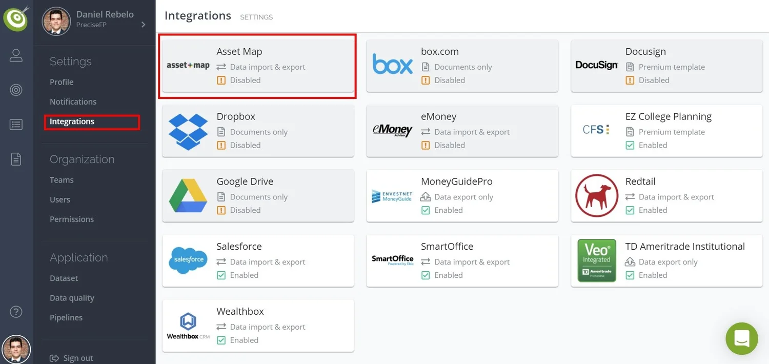 Quickly and easily connect Asset-Map through PreciseFP (only needs to be done once and you do not need to set up the integration within Asset-Map). It’s as simple as clicking a button to import the relevant data, whether it be an individual client or an entire household.