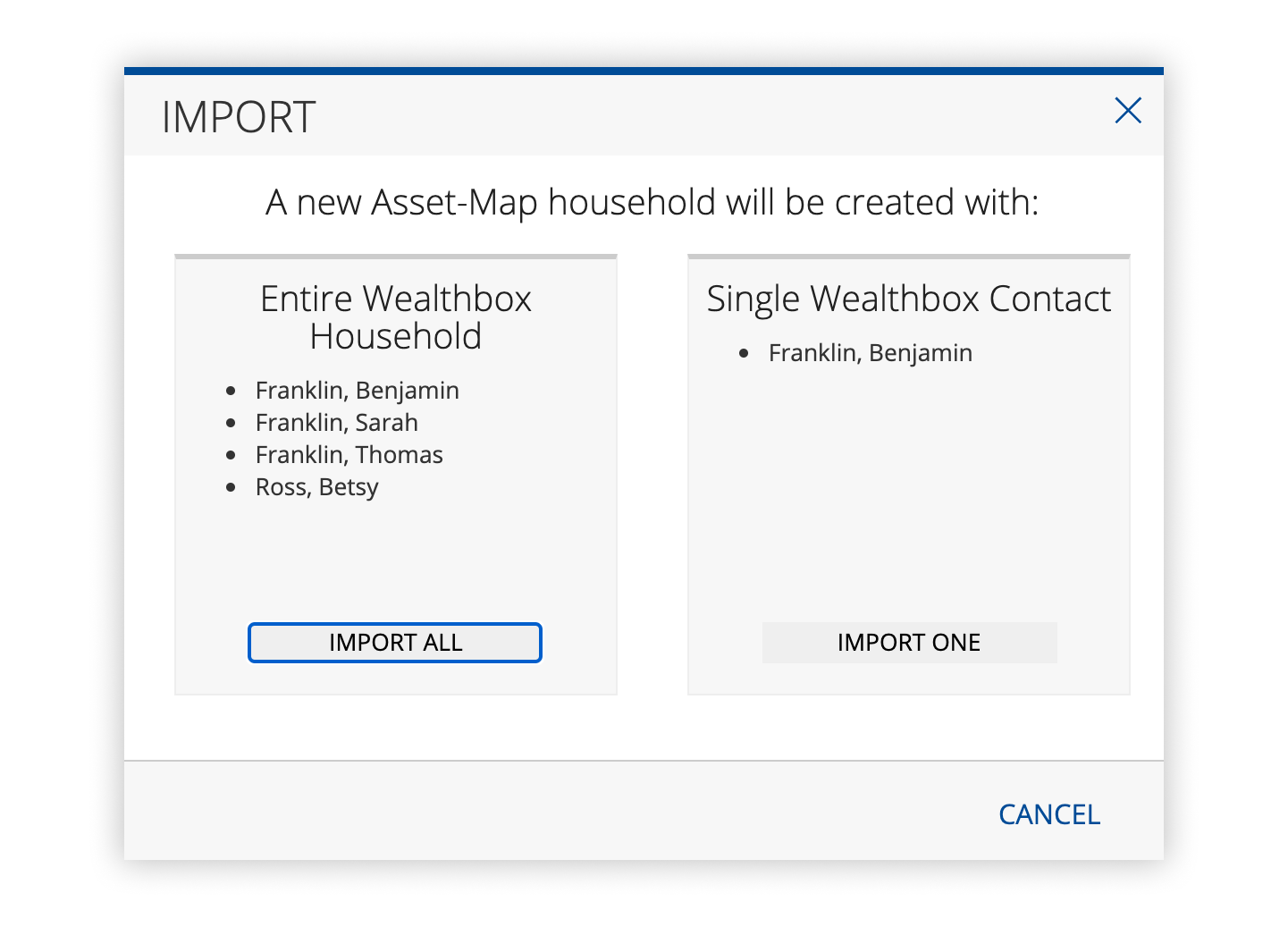 Quickly and easily create new households or update an existing household with our synchronization tool. The Asset-Map and Wealthbox integration is as simple as clicking a button to import the relevant data, whether it be an individual client or an entire household.