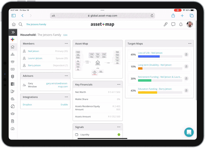 Asset-Map is a SaaS solution that provides financial advisors with a dynamic and highly effective client engagement process along with tools for client profiling. Created by successful financial professionals, Asset-Map facilitates comprehensive fact-finding to meet ‘Know Your Client’ (KYC) regulatory initiatives and uncover details important to the client for making informed financial decisions.