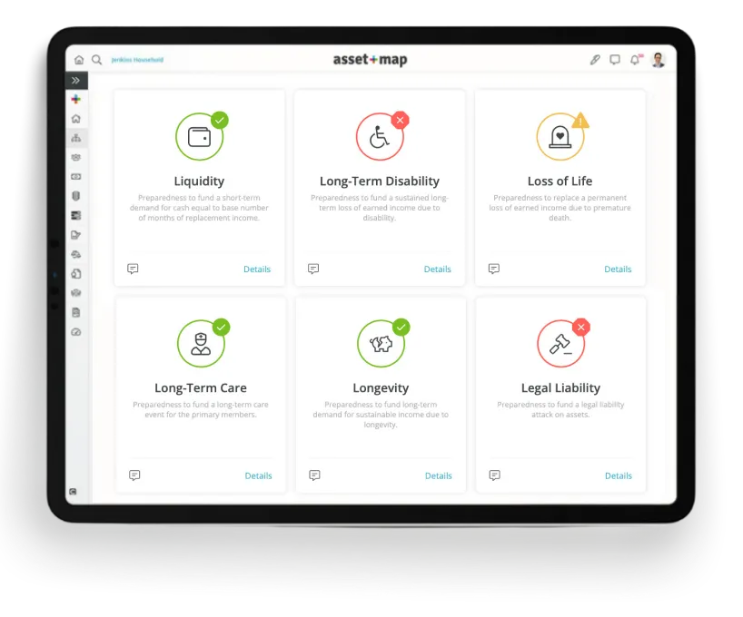 Anticipate your clients’ potential financial weak spots before they occur. Use our award-winning Signals™ feature to quickly indicate a household’s ability to weather up to six common financial events based solely on their Asset-Map Report.