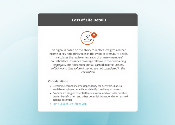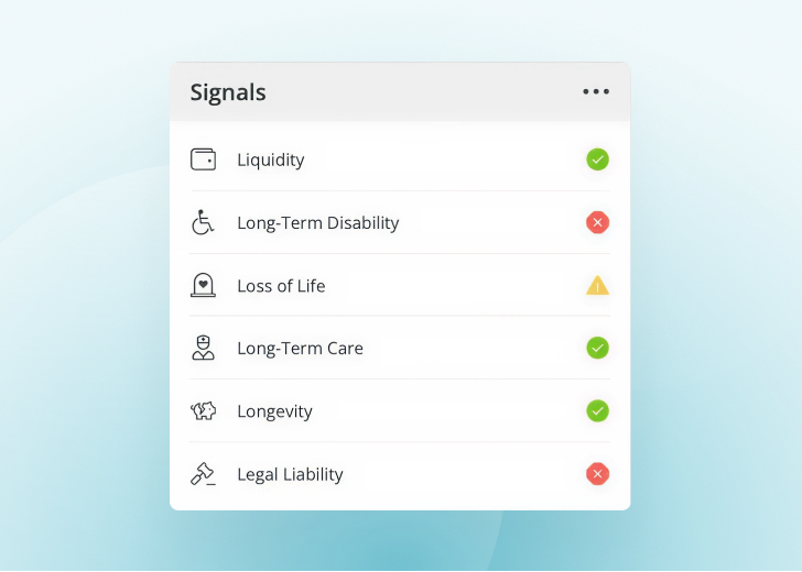 Signals are mathematical, formula-based indicators that identify a client’s potential funding gaps. Financial professionals and their clients can see whether there is a potential exposure that needs attention in these six areas (Liquidity, Long Term Disability, Loss of Life, Long Term Care, Longevity, and Legal Liability.)