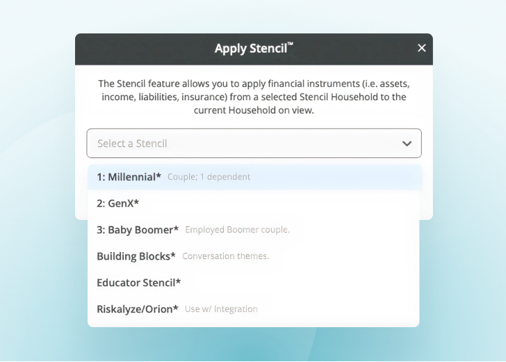 Professionals see the best results when they customize Stencils using their own language. Easily create or modify Stencils just like editing a household and even layer multiple Stencils for a personalized, dynamic view of a client’s finances.