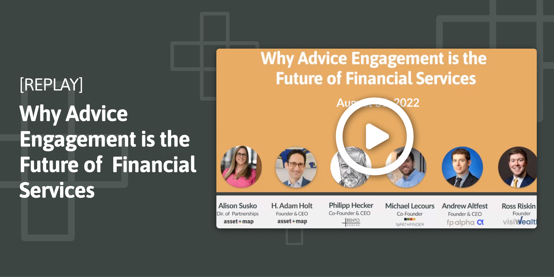 What is advice engagement?As defined by Michael Kitces, Advice Engagement software solutions help engage prospects or clients in the advice delivery process. Advice Engagement tools are intended to deepen engagement in the advice process and increase the likelihood of the prospect or client buy-in and follow-through with the advice recommendations themselves. This webinar brought together five Advice Engagement companies: Asset-Map, Bento Engine, FP Alpha, fpPathfinder, and visiWealth.Leaders from each company discussed the impact the advice engagement movement is having on the financial services industry. They also shared strategies for increasing the likelihood of prospects or clients following through with and subsequently purchasing your advice recommendations.Speakers included:H. Adam Holt, CFP®, ChFC® (CEO & Founder, Asset-Map)Philipp Hecker (CEO & Co-Founder, Bento Engine)Michael Lecours (Co-Founder, fpPathfinder)Andrew Altfest (CEO & Founder, FP Alpha)Ross Riskin (Founder, visiWealth)
